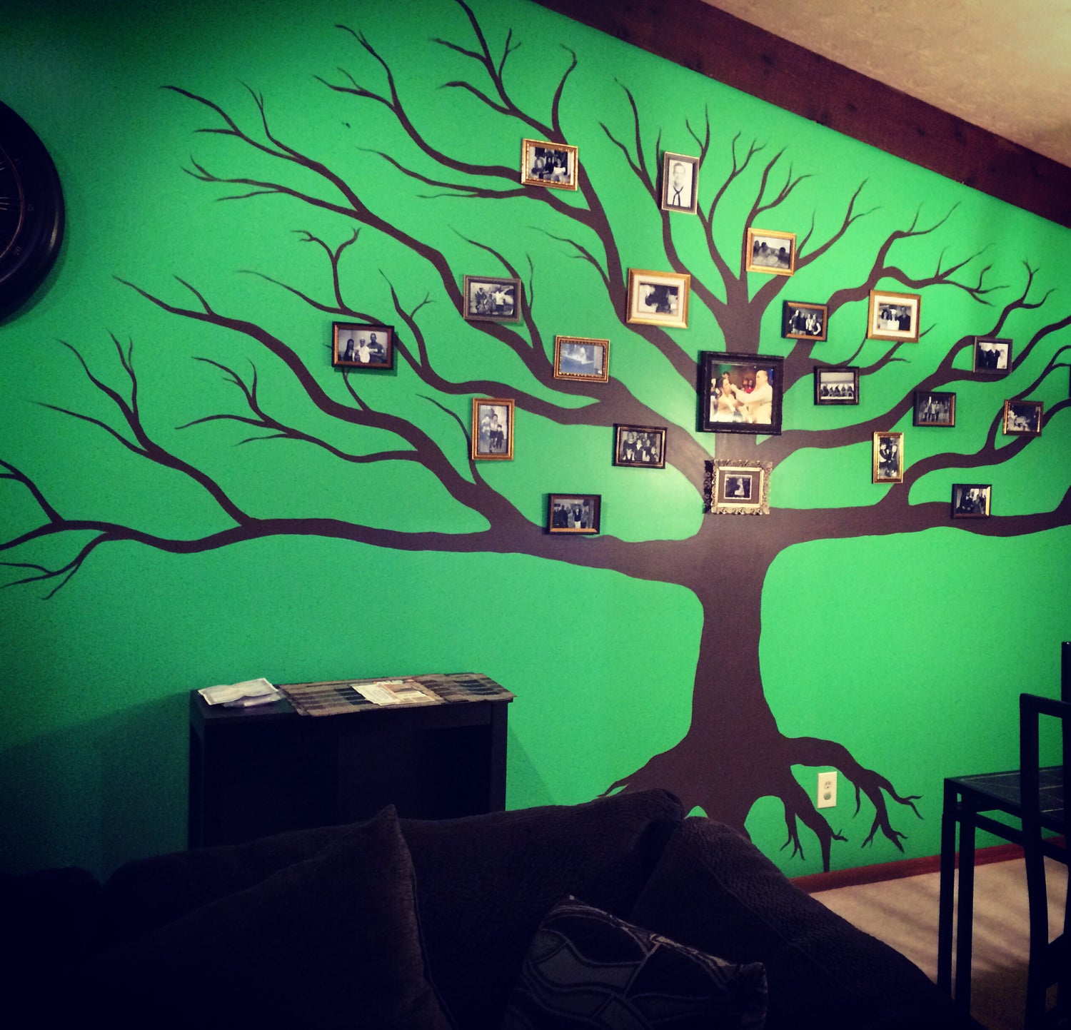 I created this in my first home my husband and I had. We printed black & white photos of both of our extended families to make our own new tree. Our focal point being us smashing cake in our faces at our wedding and our ultrasound of our daughter to announce to our families.