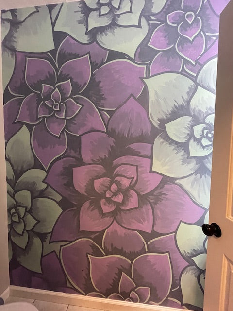These hand-painted succulents bring a touch of calm into the space. Their elegant shapes and soothing tones create a spa-like atmosphere. A simple yet striking detail that makes the room feel alive.