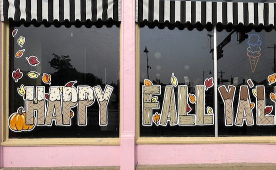 I had so much fun painting the Aglamesis Bros windows in Hamilton! Playful fall elements mix with ice cream and chocolates to make the storefront irresistible. It’s a sweet and seasonal display that brings smiles to everyone passing by.