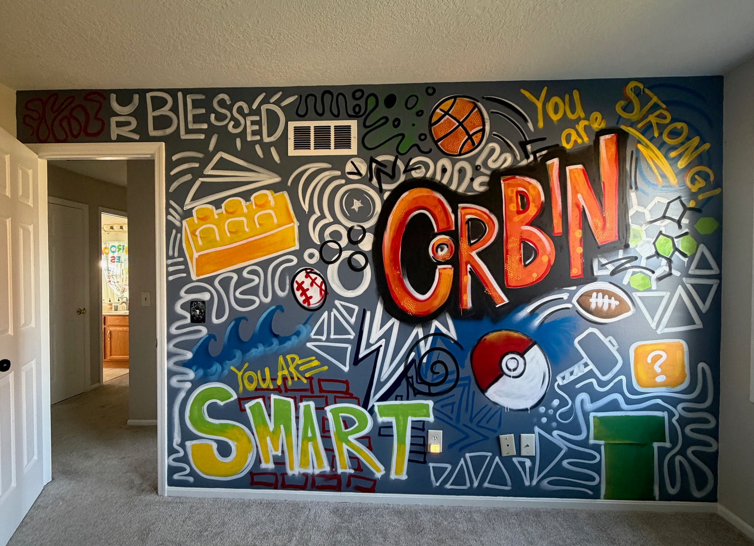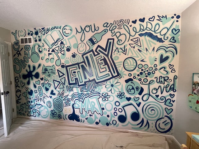 A bright, graffiti-doodle-style mural for 8 year old boy's room — packed with color, energy, and personality! 🎨✨ Fun shapes, bold lines, and playful details come together to create a space that feels creative, cool, and totally him.