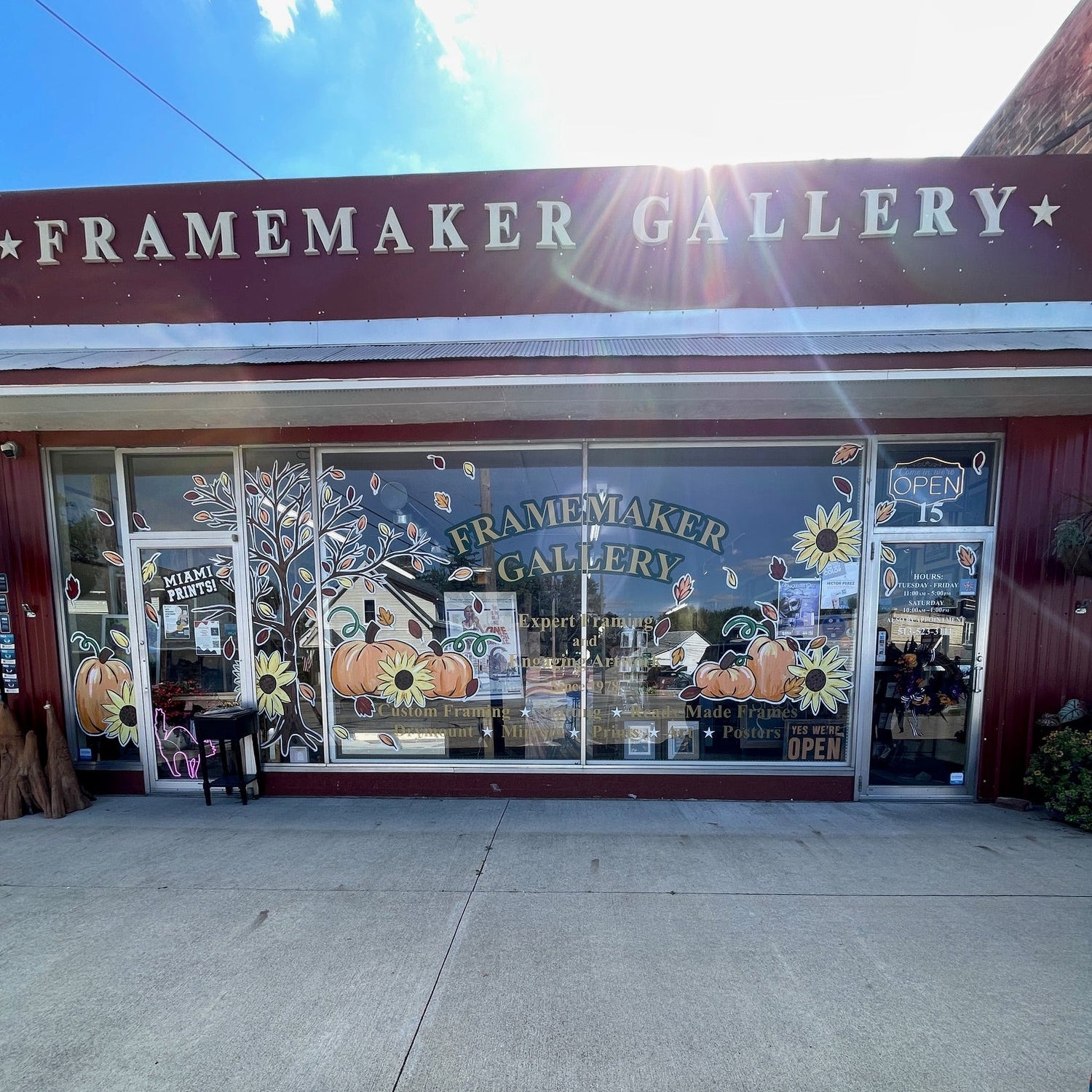 Autumn is in full swing at Framemaker’s Gallery in College Corner! The windows come alive with a beautiful fall scene — a colorful tree surrounded by pumpkins, swirling leaves, and warm, cozy hues. It’s a perfect touch of seasonal charm that welcomes visitors to stop in and enjoy the beauty of the season. 🍁🧡