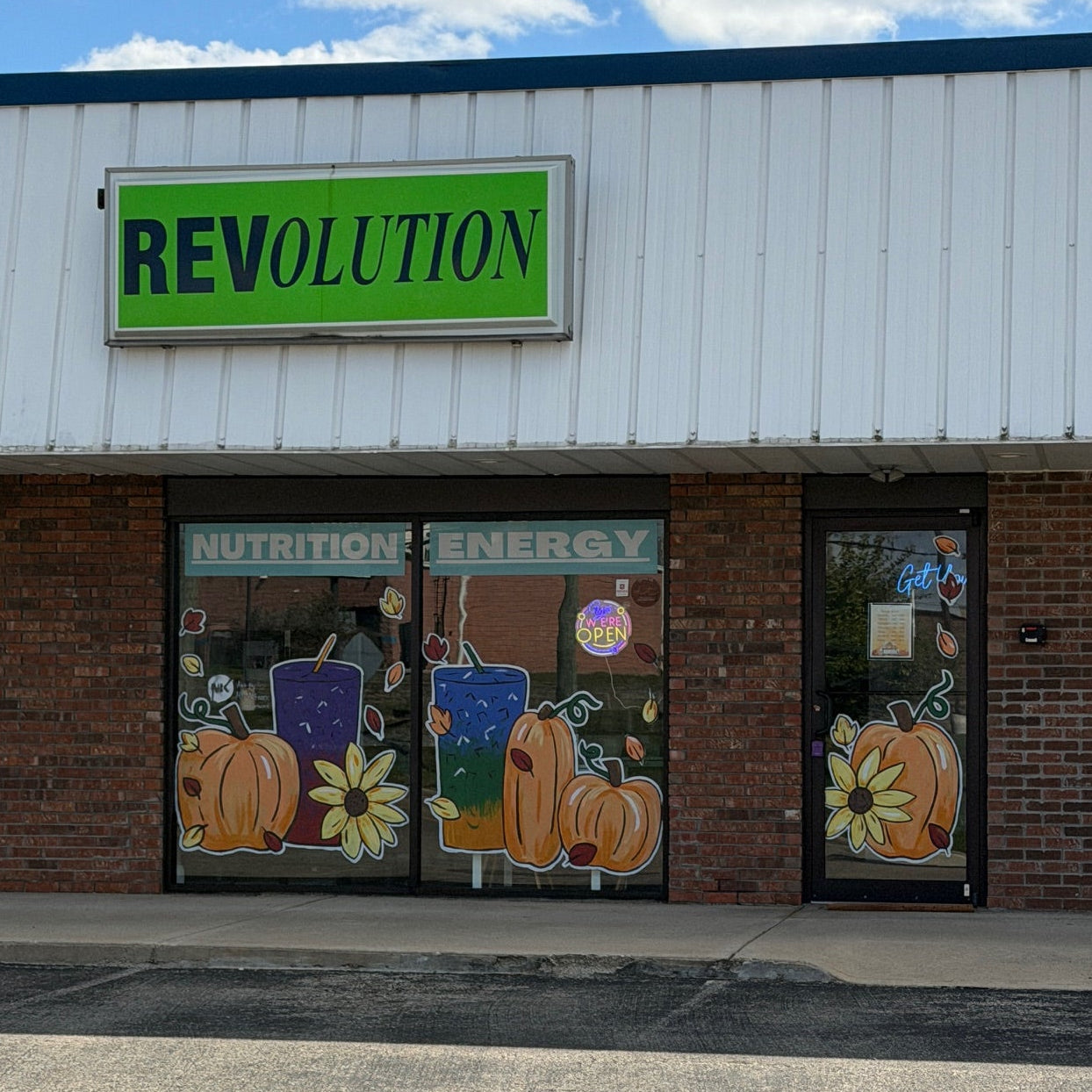 Fall has arrived at Revolution Nutrition with cozy, colorful windows featuring cheerful pumpkins, autumn flowers, and fall-inspired vibes! The playful designs pair perfectly with their delicious teas and shakes, creating a warm, welcoming feel that celebrates the season and invites customers to sip, smile, and stay awhile. 🍂✨