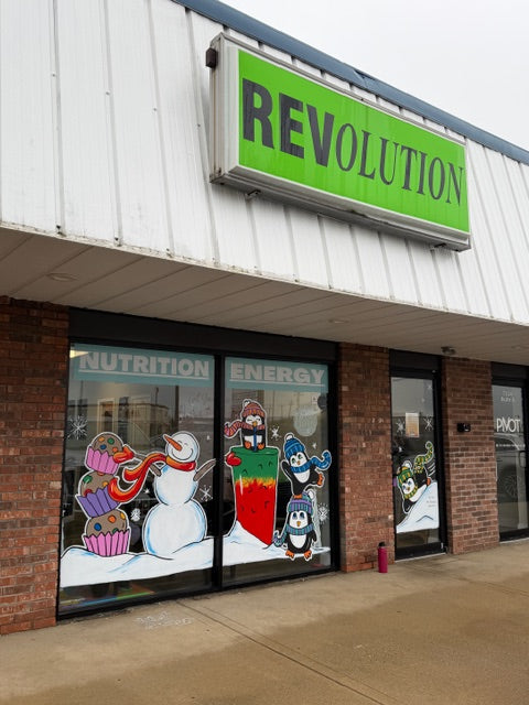 Winter fun has arrived at Revolution Nutrition with playful, cozy windows featuring stacked penguins tumbling around, sipping on tea, and getting into a cute stack of protein balls topped with M&M’s! The cheerful winter designs pair perfectly with their delicious teas and shakes, creating a fun, welcoming vibe that invites customers to sip, smile, and stay awhile. ❄️🐧✨