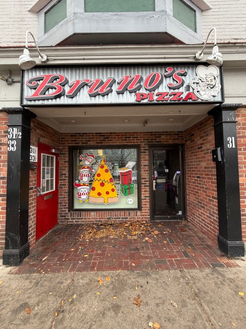 Holiday cheer rolled into Bruno’s Pizza with festive, playful windows featuring a slice of pizza dressed up like a Christmas tree—lights and all—alongside stacked penguins and wrapped presents. The fun, whimsical design brings cozy holiday vibes and just the right amount of cheesy cheer, inviting customers to grab a slice and celebrate the season. 🎄🍕✨