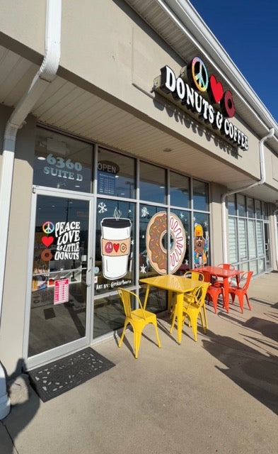 Winter vibes brewed up at Peace, Love & Little Donuts in Mason with a bold cup of coffee, a donut split across two windows to spotlight two different flavors, and the Donut Dude bundled up and enjoying his coffee in the cold. Finished with snowy details, the playful design brings cozy, crave-worthy winter fun to the storefront. ❄️☕🍩✨