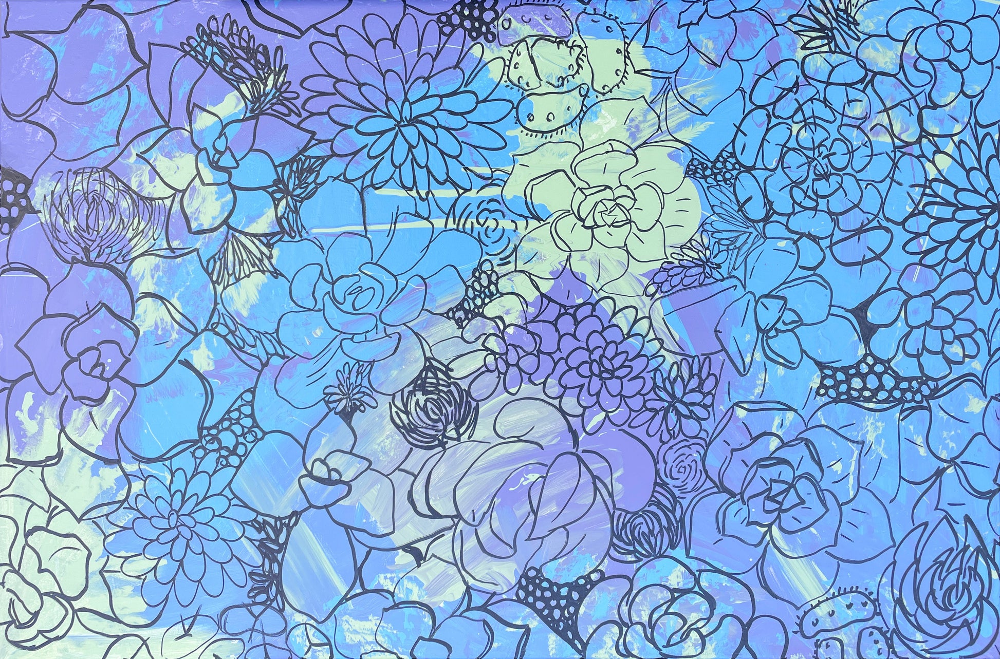 A painting on canvas that is a lively mix of linework and color inspired by the beauty of succulents — bold, organic shapes layered with playful doodles and flowing patterns. This piece celebrates growth, resilience, and the joy found in nature’s little details. Artwork is professionally framed with traditional black boarder to complement the design.